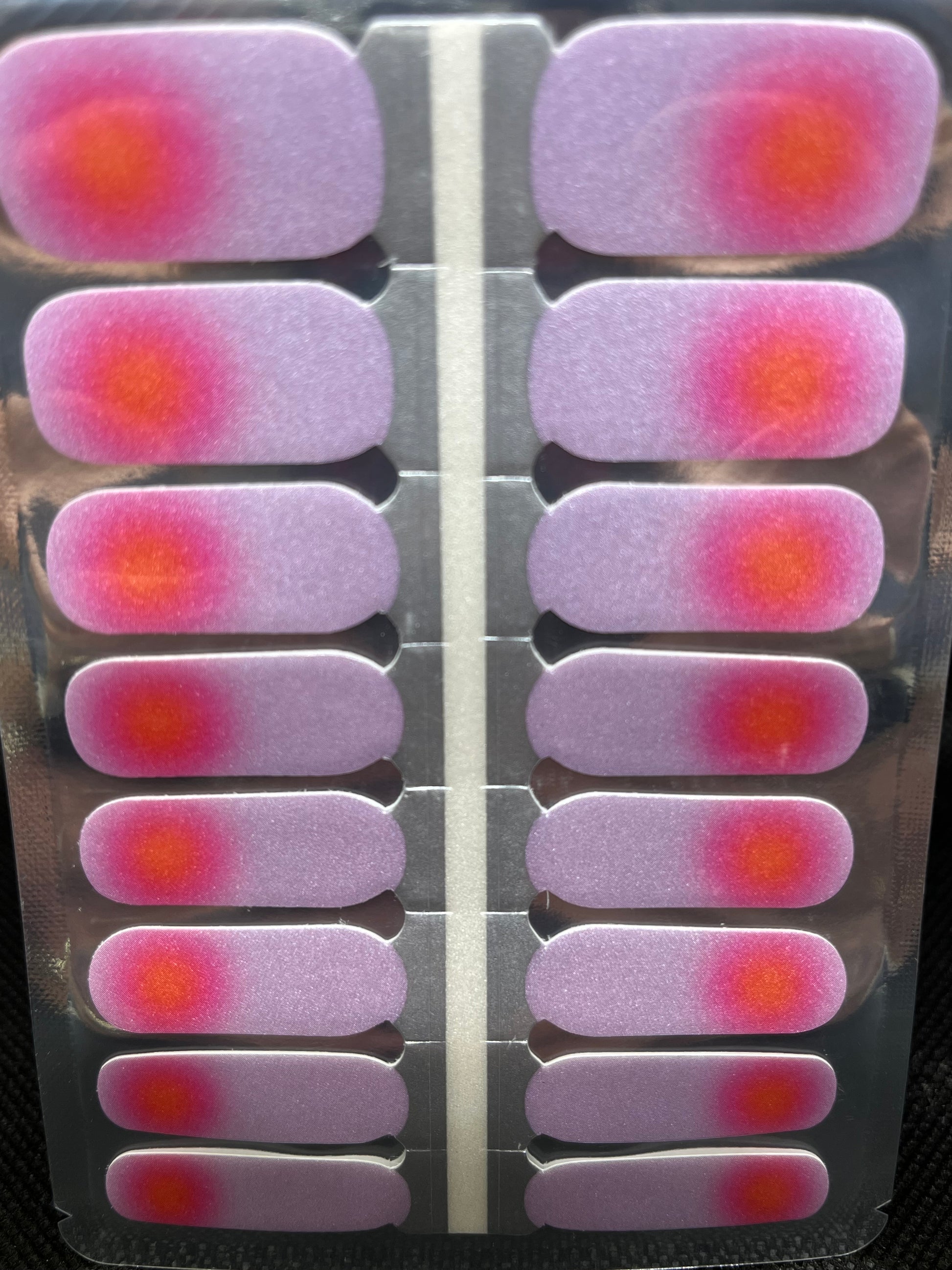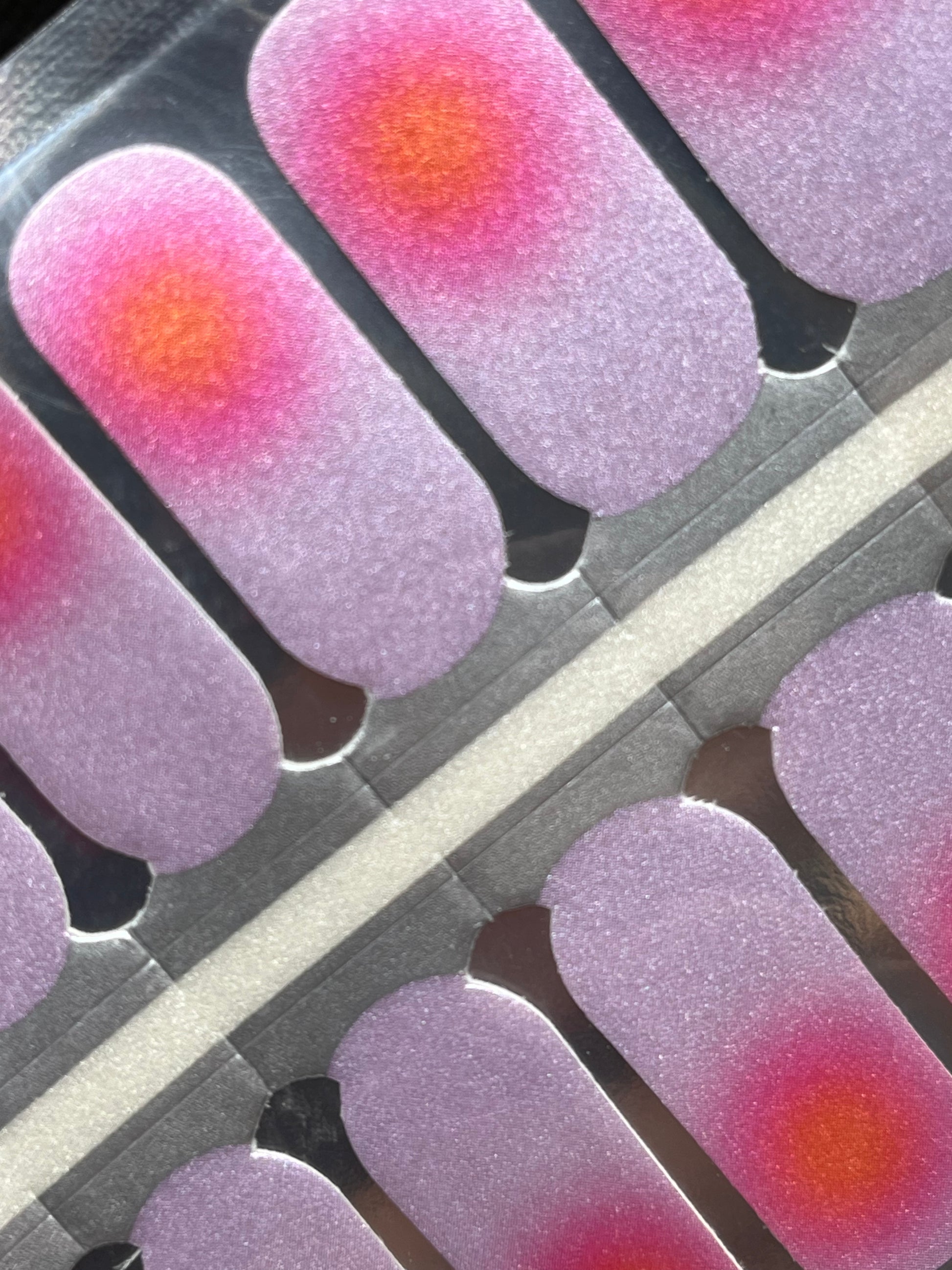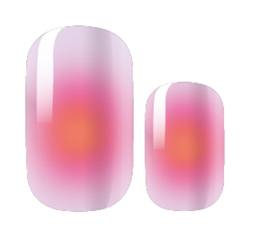 >Semi-translucent pale lavender background with a hot pink and orange glow at the base of the nail that creates a super pretty highlight.