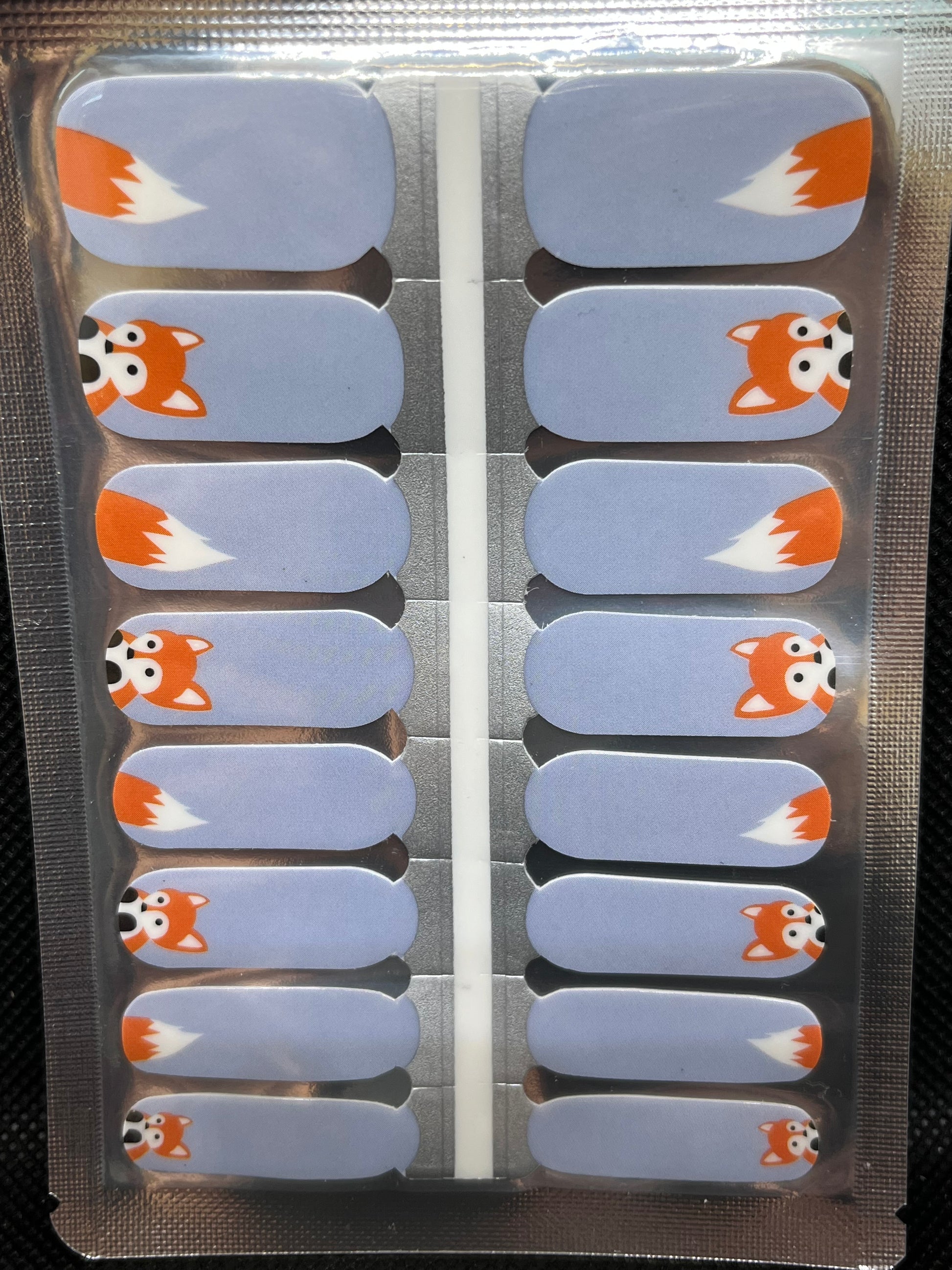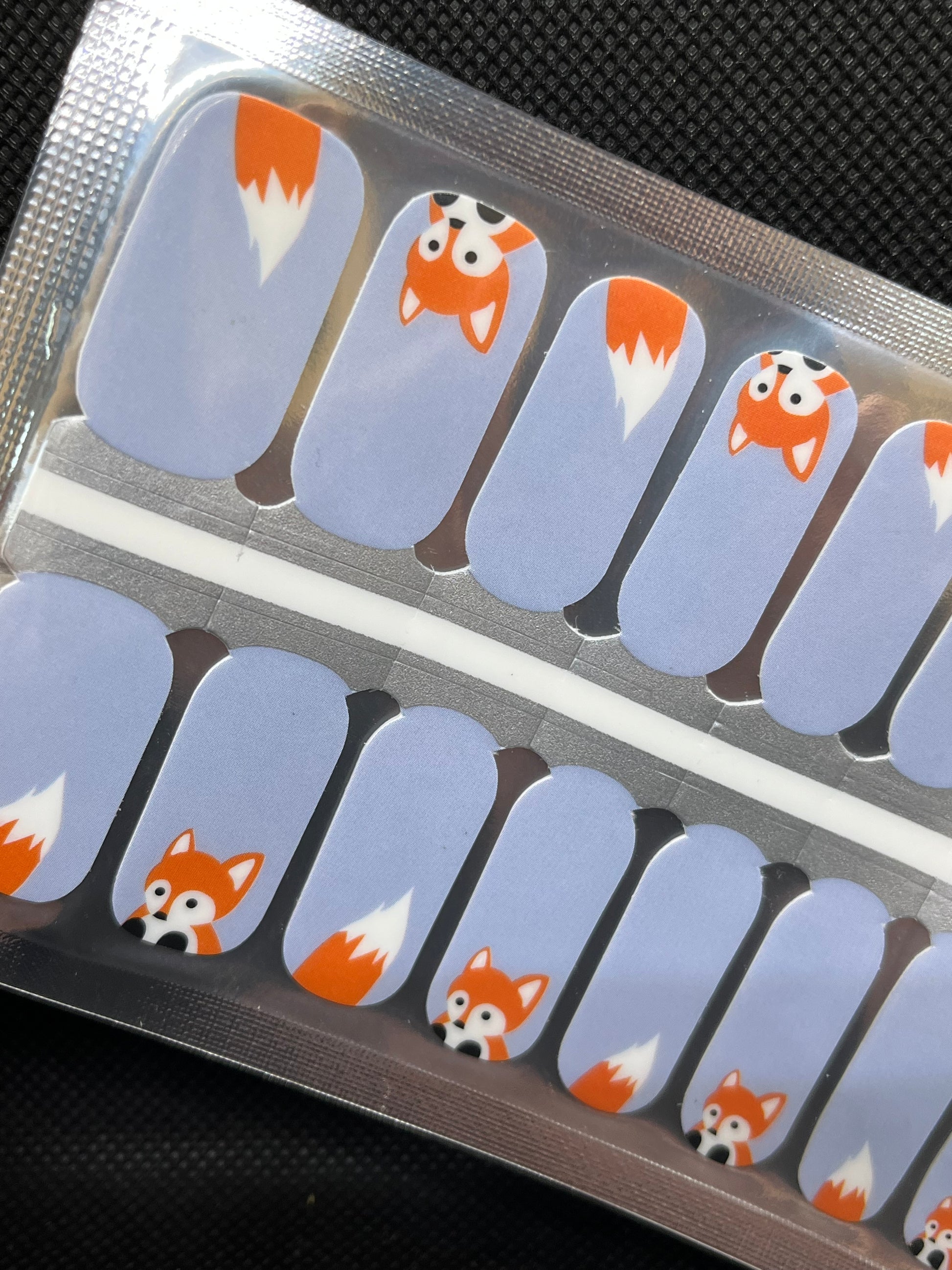 > Pale blue-grey background with little red fox head or tail at the base of the wraps.
