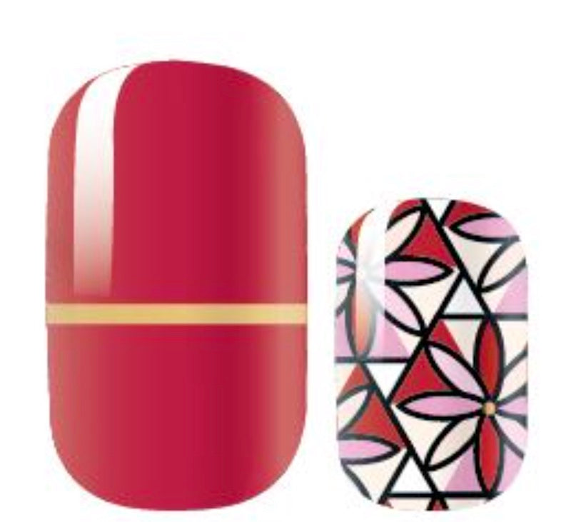 >Mix of solid pink, red w gold stripe and bold floral stained glass pattern