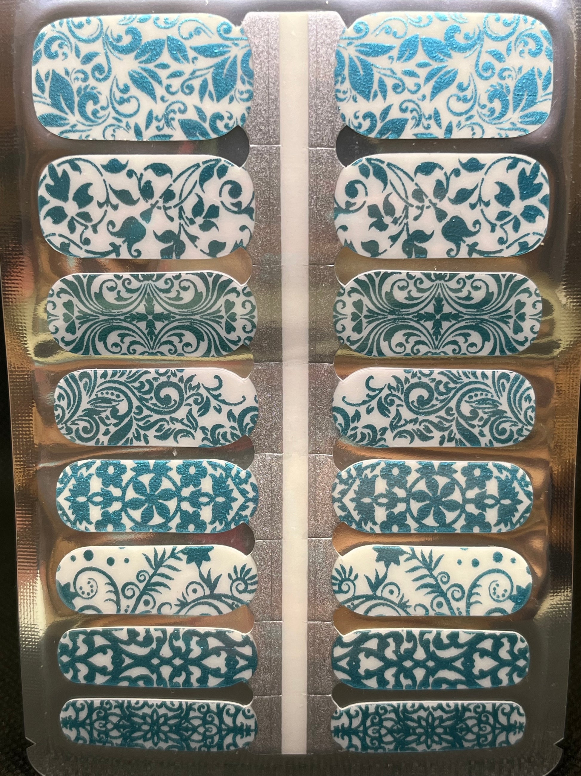 Beautiful, shiny, teal foil floral lattice design overlay. Great on its own or over your favourite polish or a solid-coloured wrap.