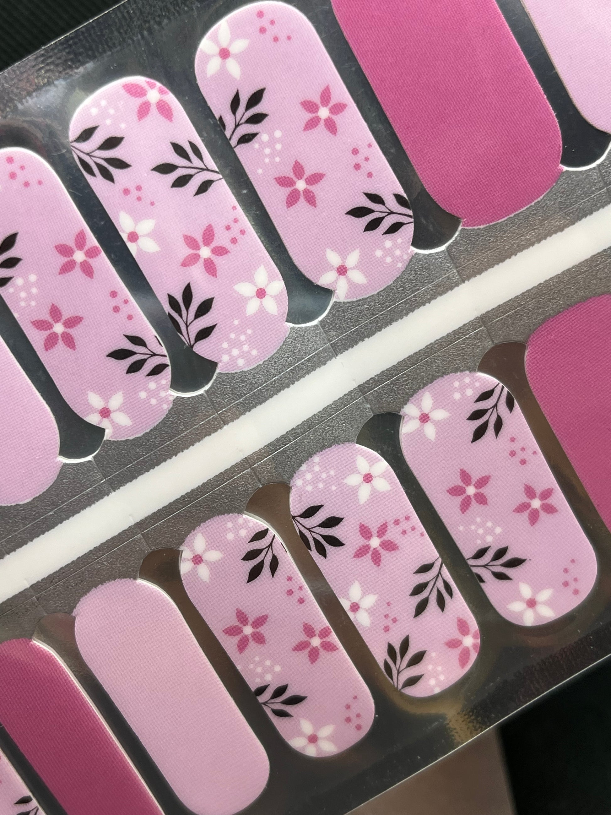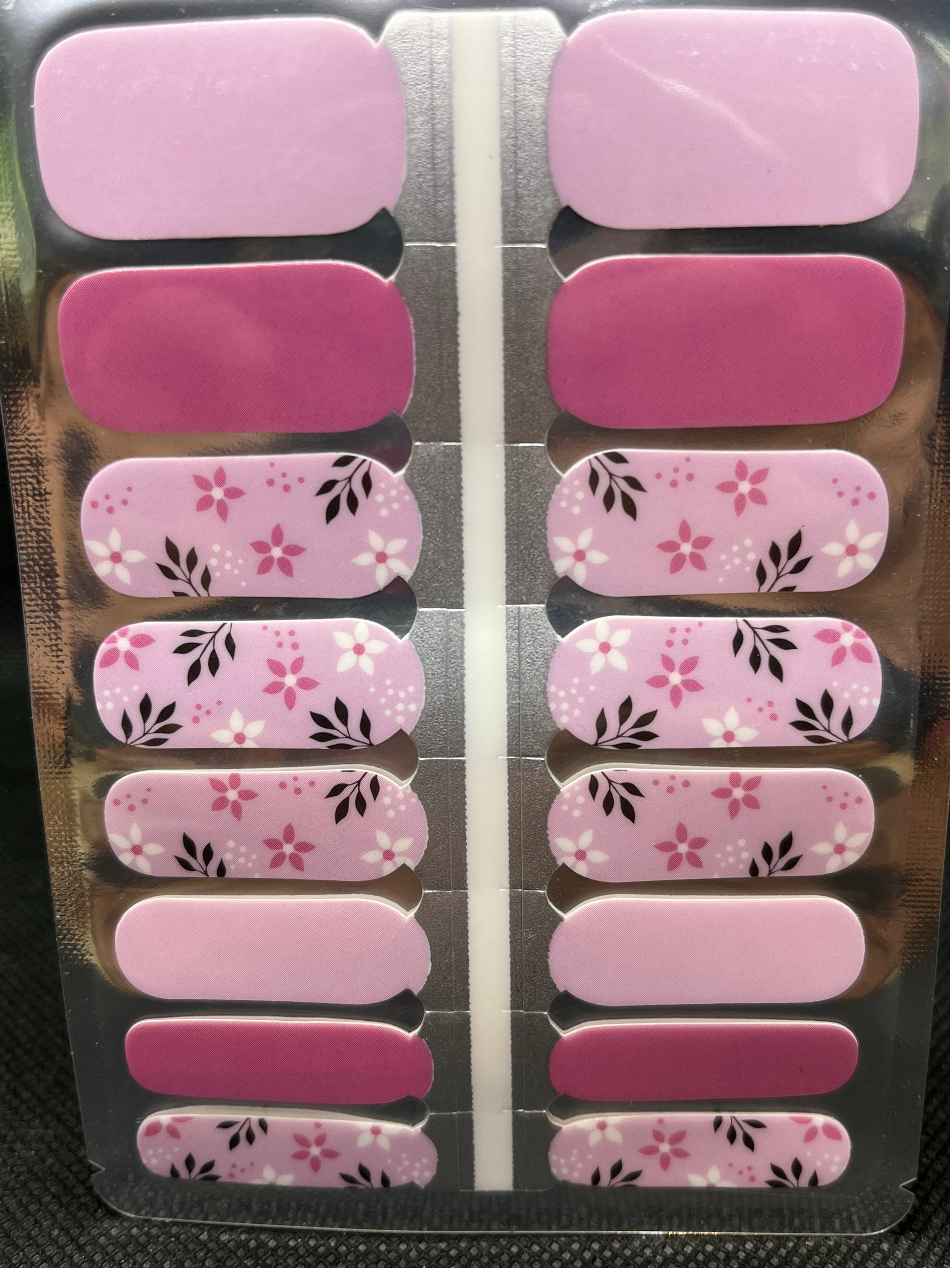 >4 solid light pink wraps, 8 light pink wraps with scattered white & dark pink flower w black leaves, 4 solid dark pink wraps