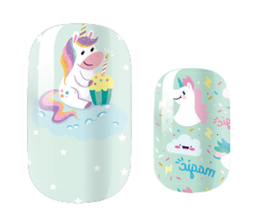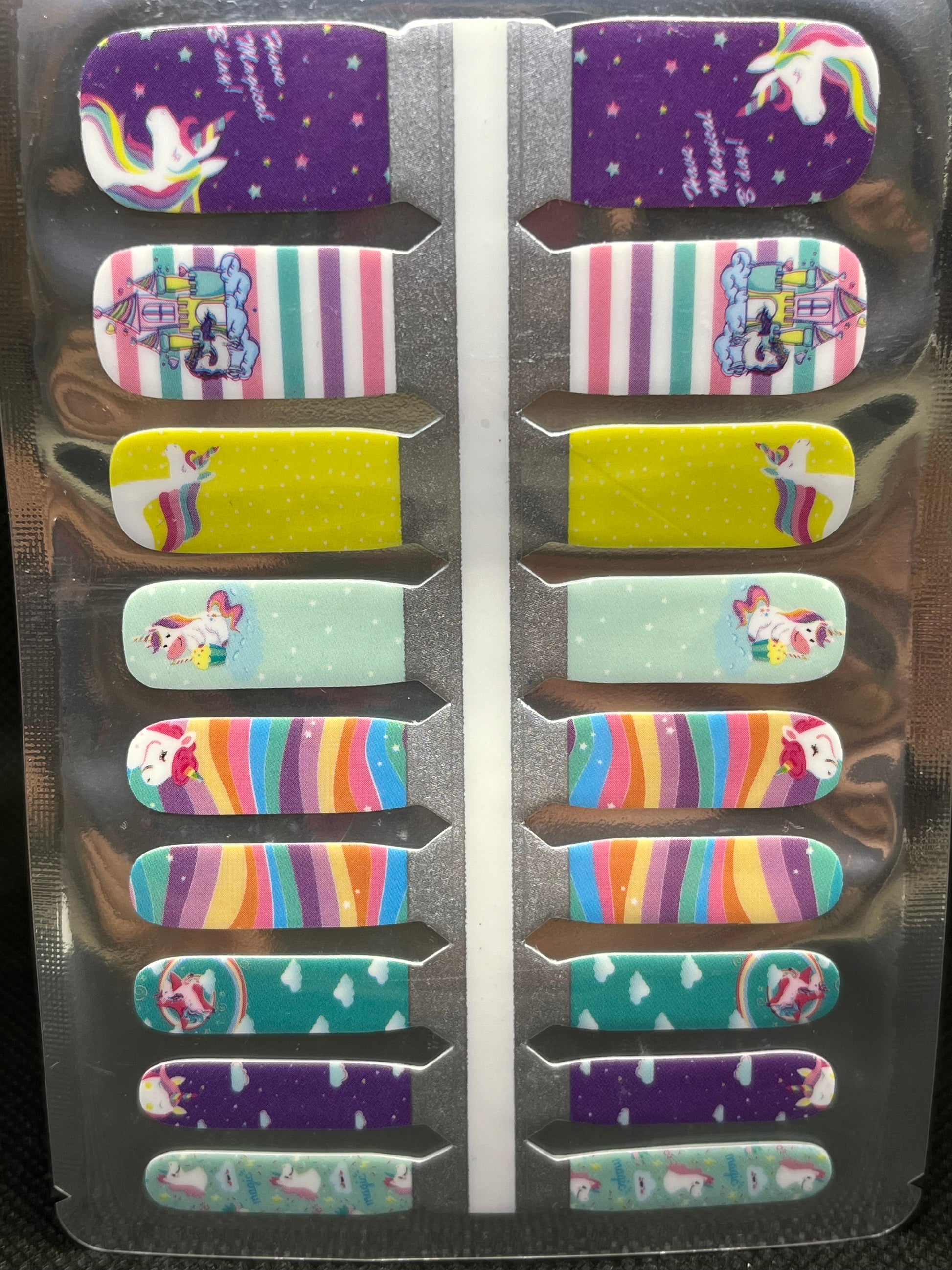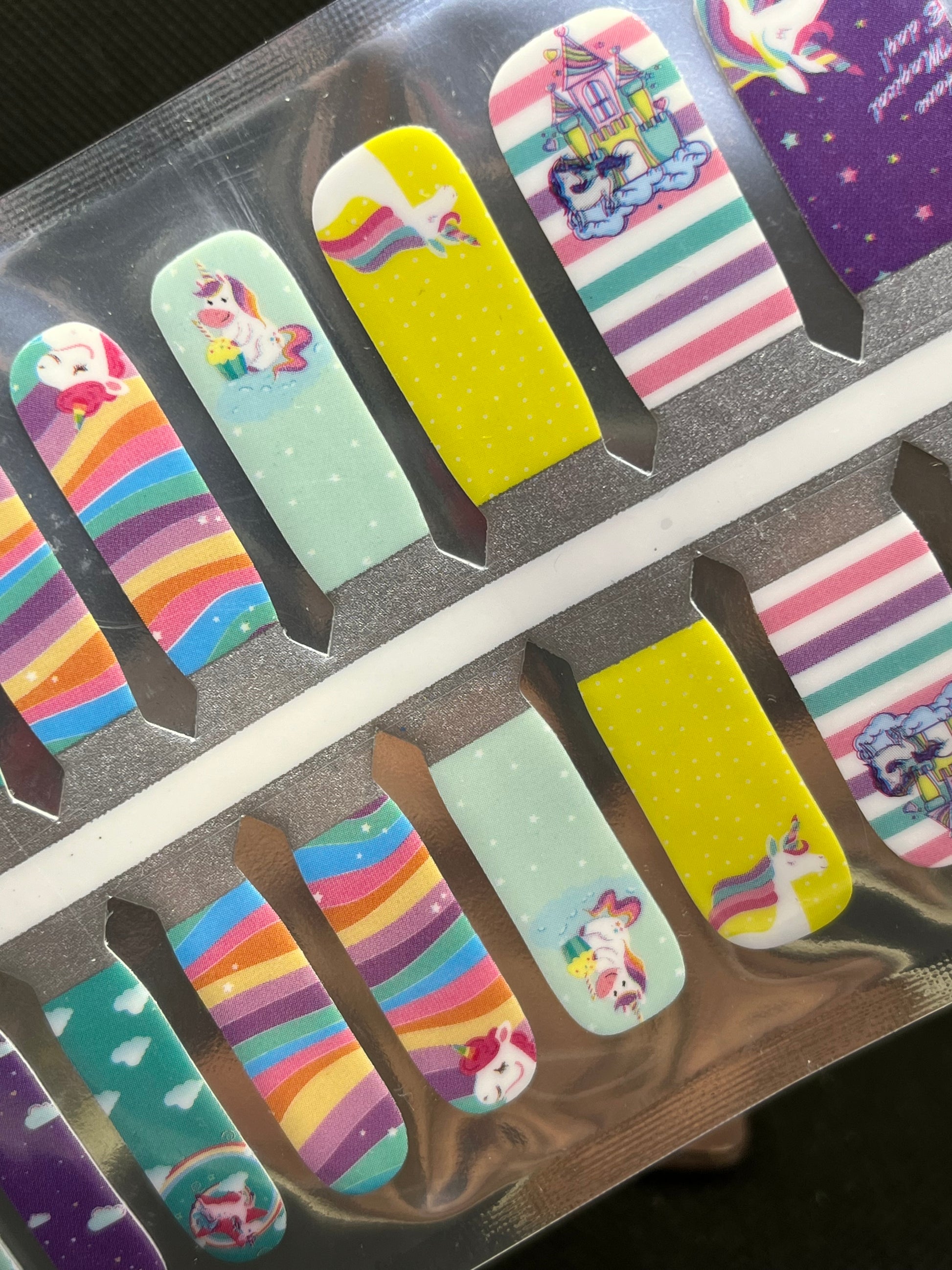 >Mix of magical rainbow colours and fun designs in stripes, dots and solids accented by a castle and cute and colourful unicorns.