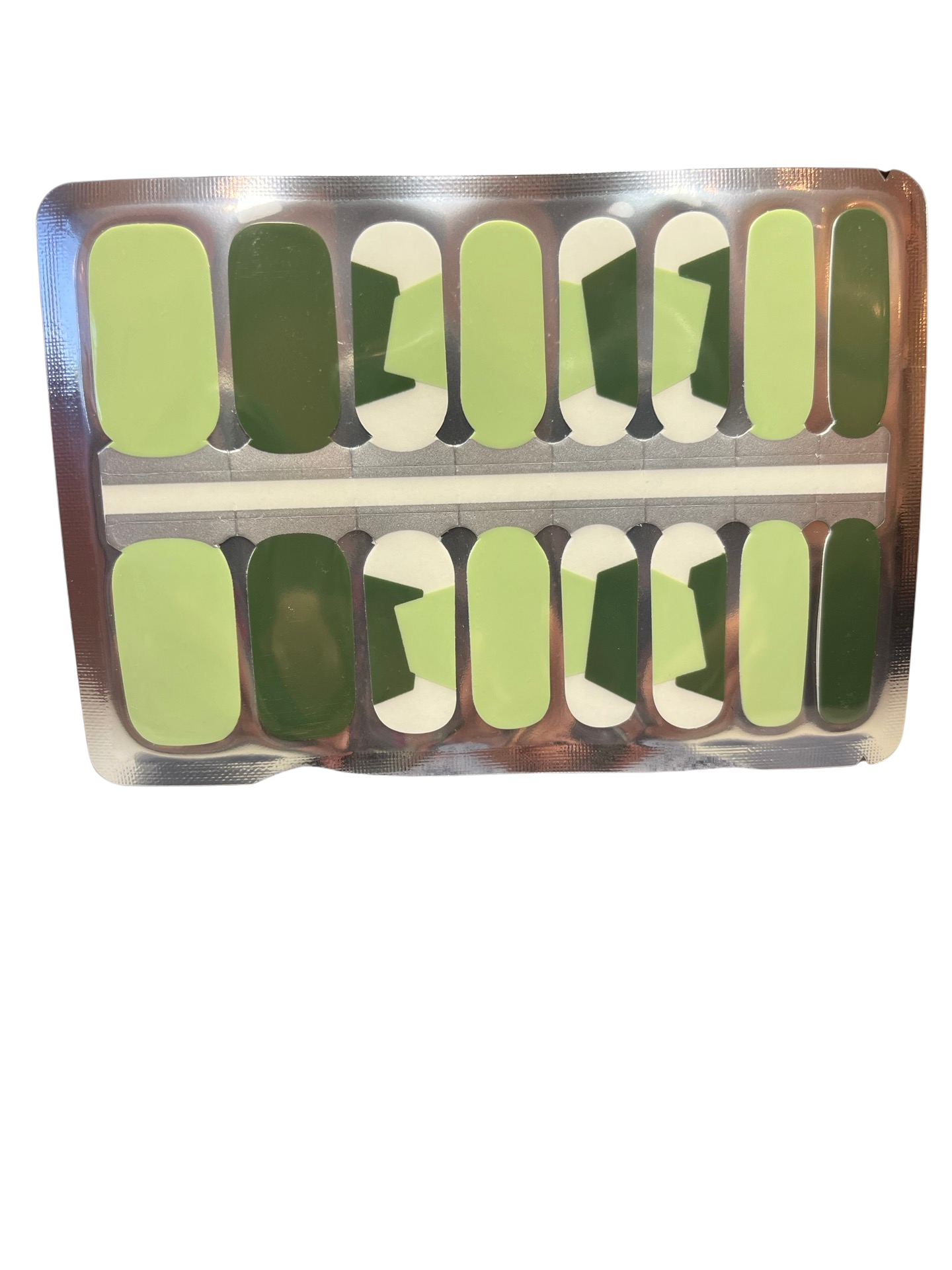 >Mix of light & dark green solid wraps  + 3 clear wraps with large geometric shapes in both greens