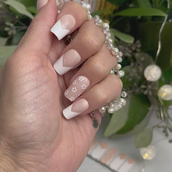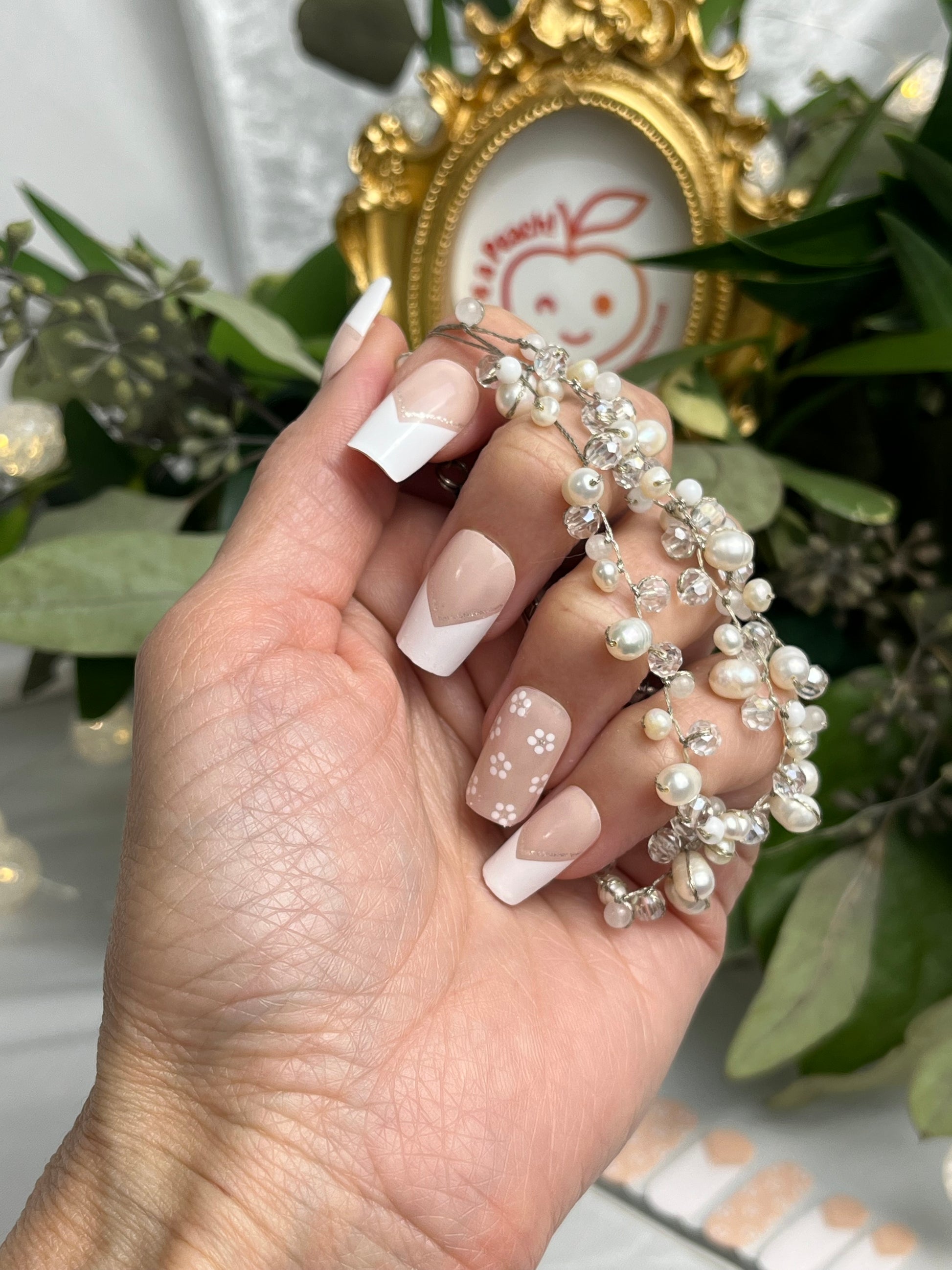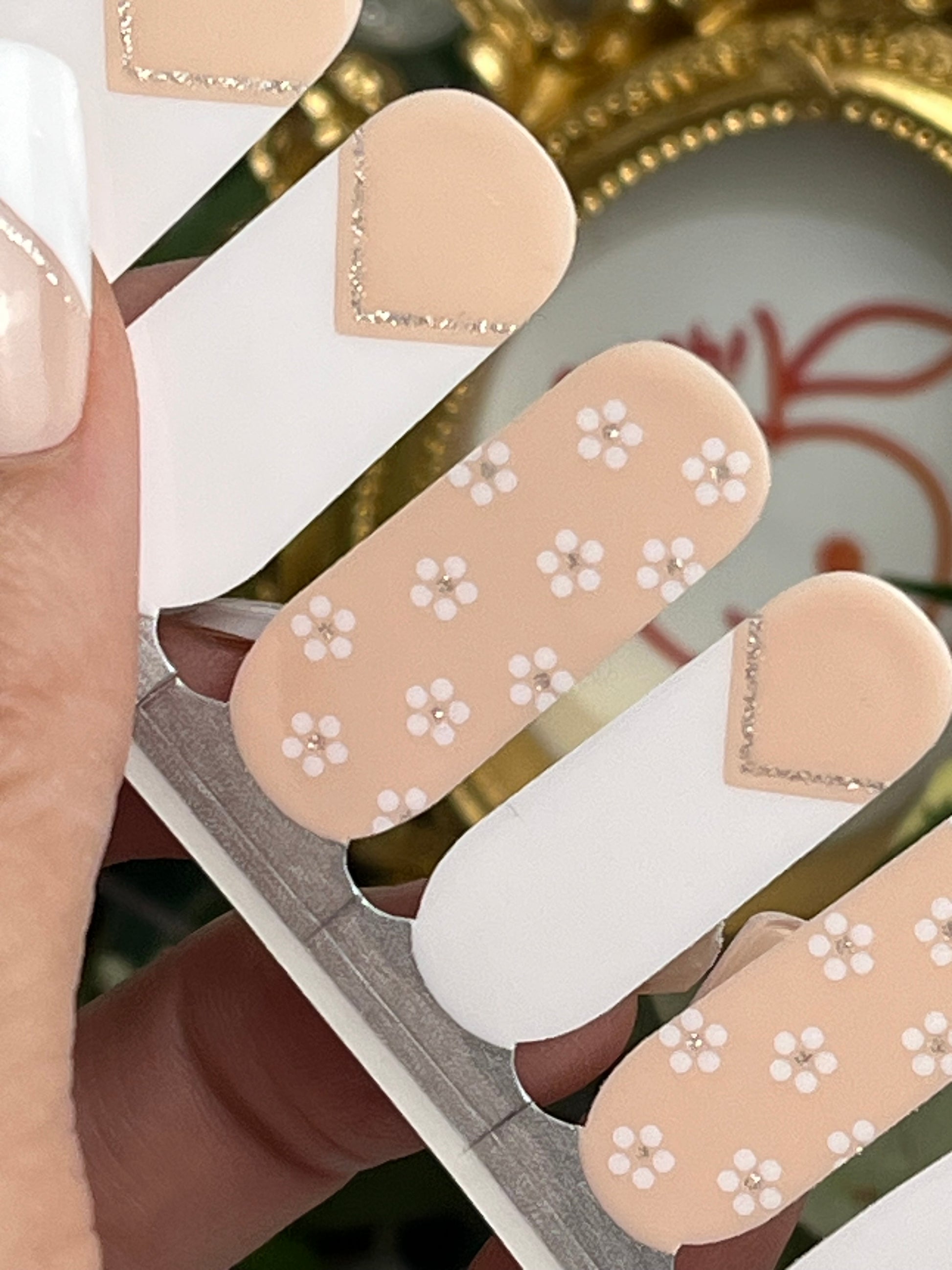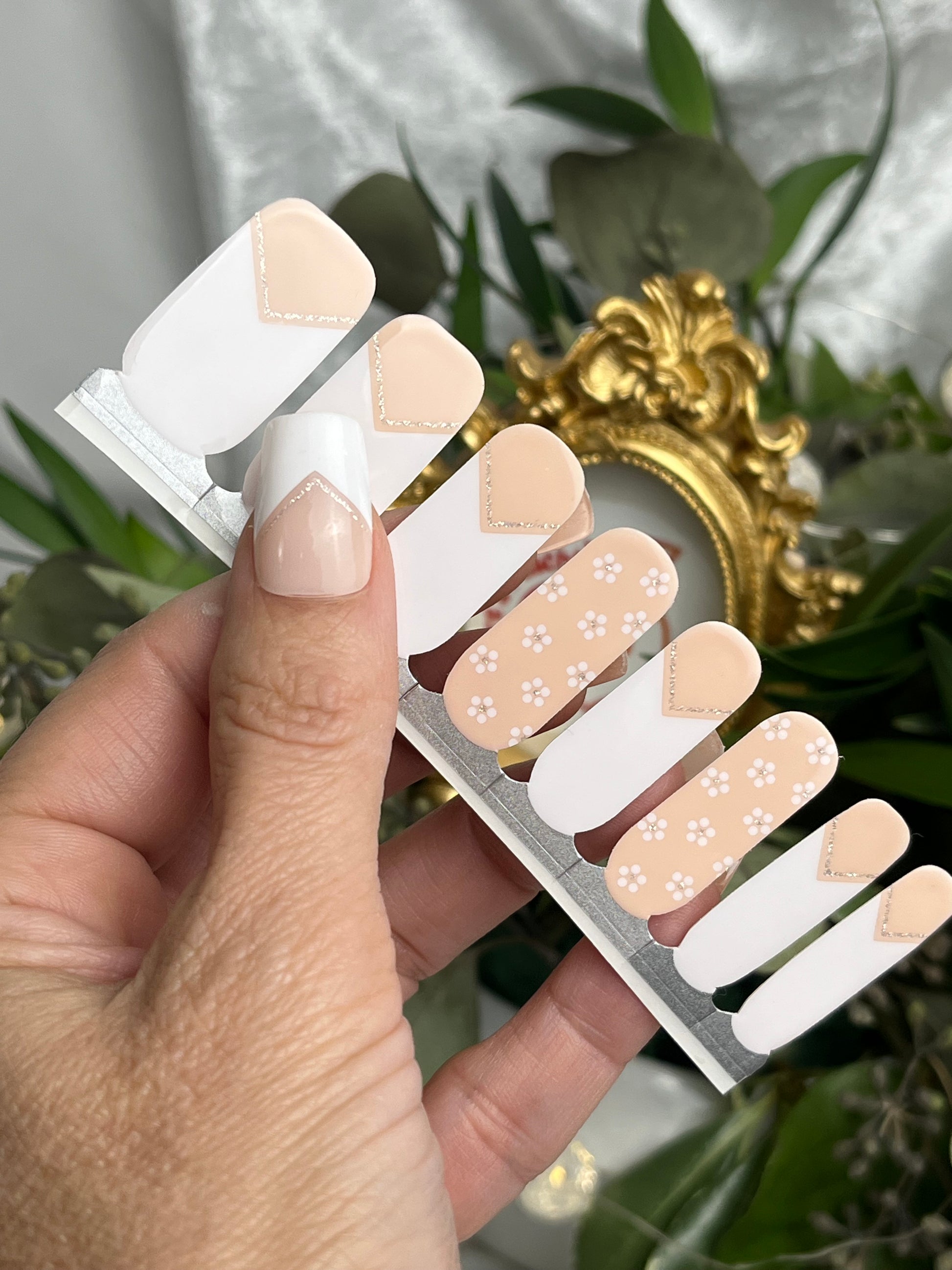 Classic meets playful with this chic twist on a French manicure! Ooh La La features elegant pointed white tips with a fine silvery stripe along the lower edge for just the right amount of shimmer. A matching accent wrap is sprinkled with tiny white daisies, each dotted with a hint of silver sparkle for a sweet, sophisticated finish.