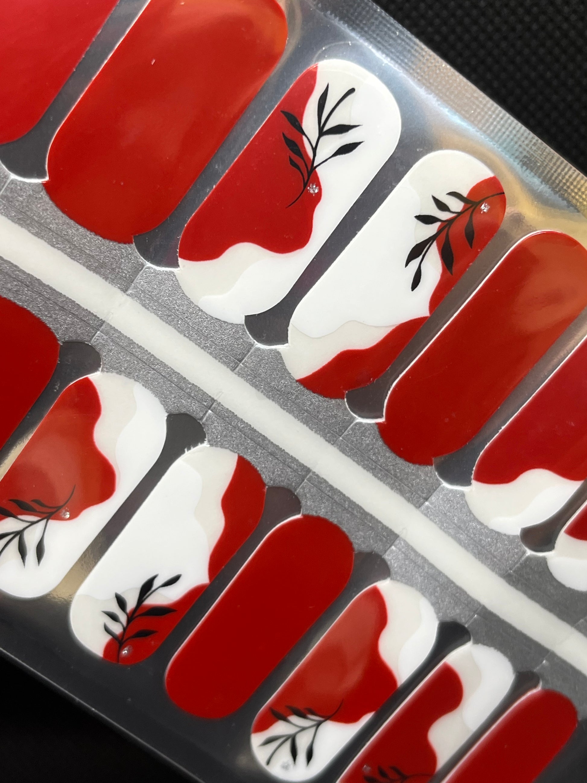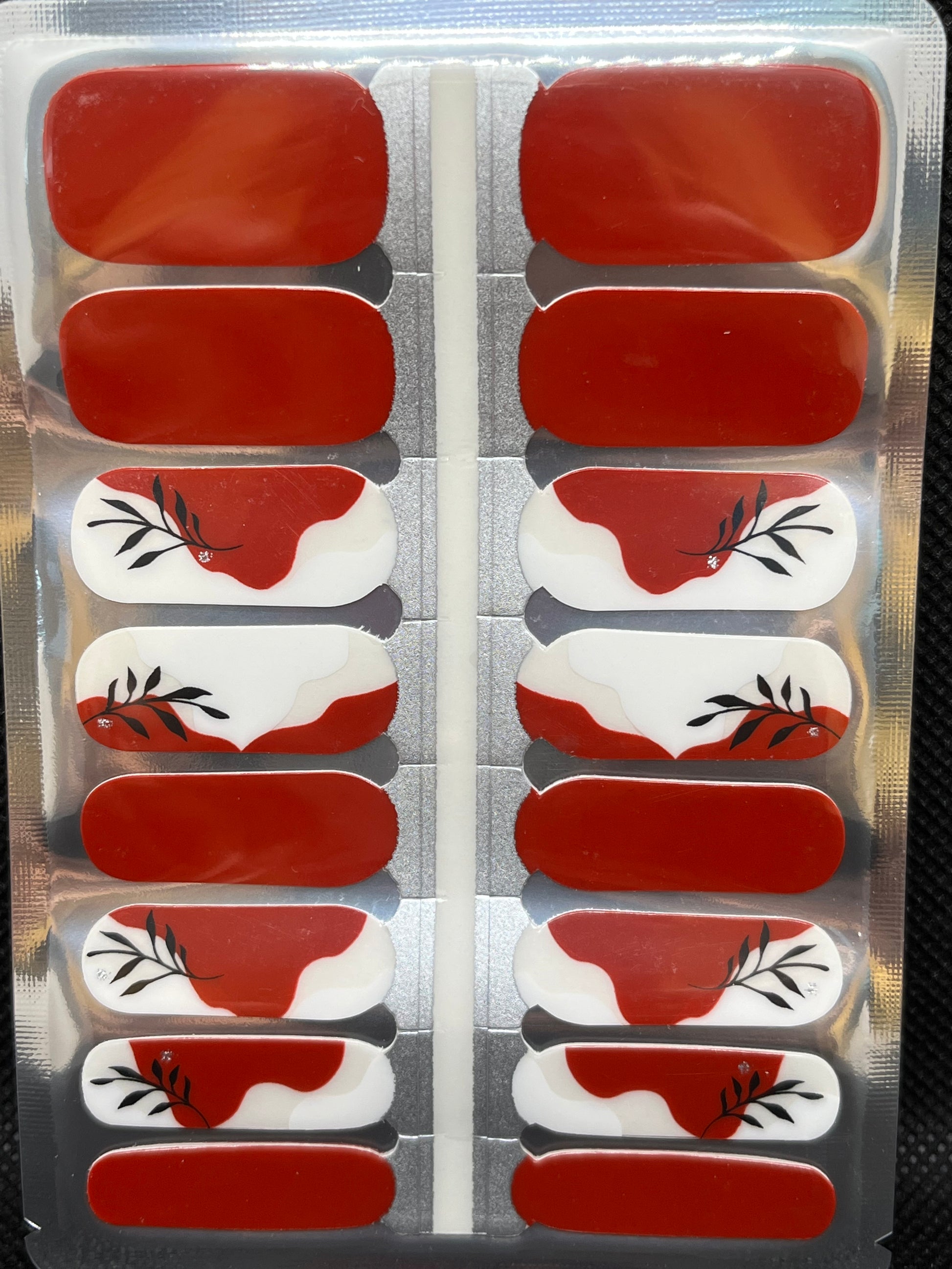 >Eight solid deep red wraps + eight wraps with red and white splotches , a black leaf stem w dot of silver glitter accent PLUS clear peek-a-boo windows.