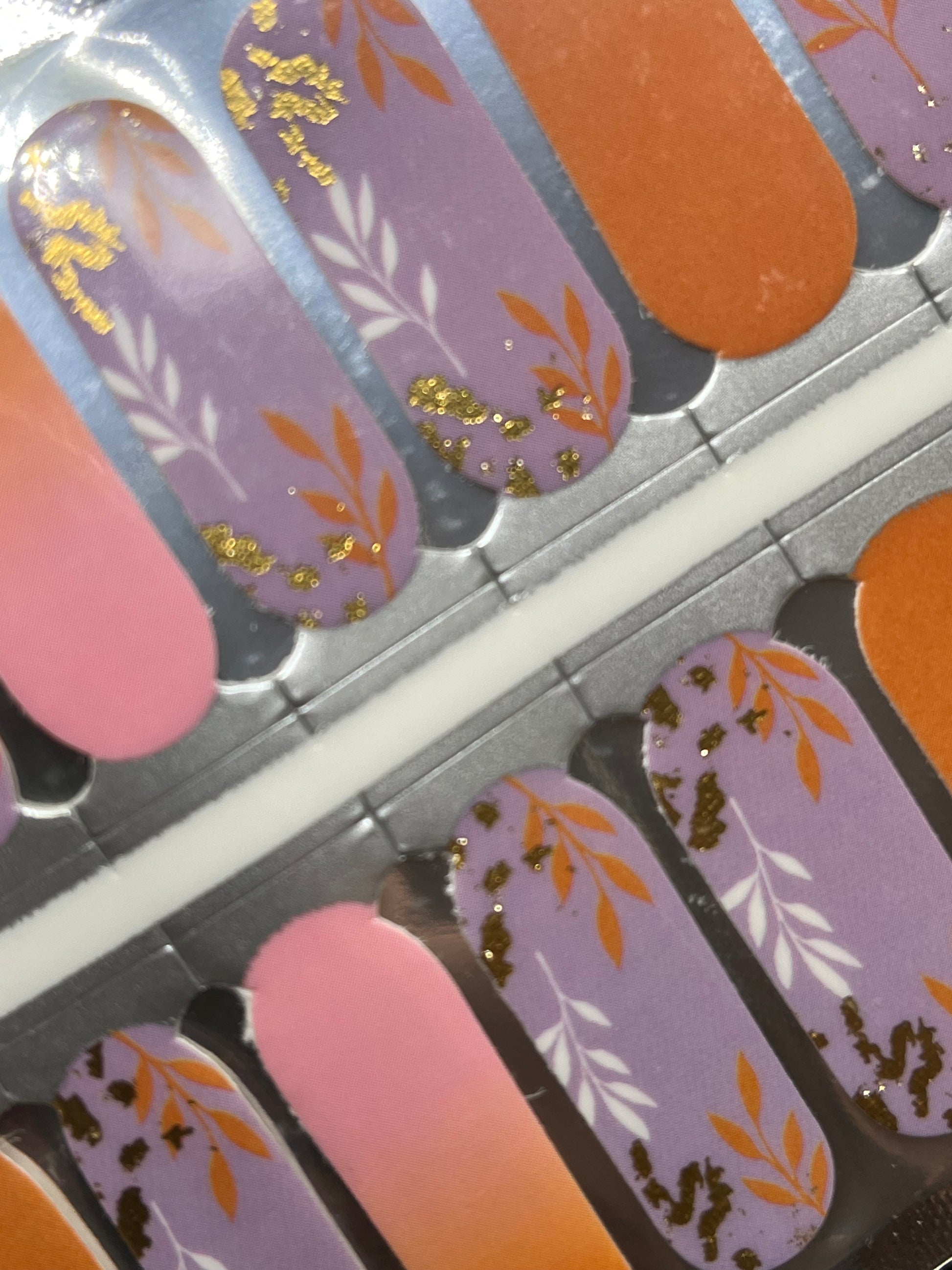 >Tangerine, lavender and pink mix in this design of solids, ombre gradients, sprigs of leaves and splashes of antique gold leaf accents. Fun & sophisticated.