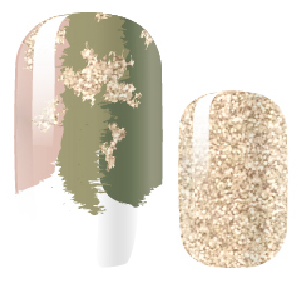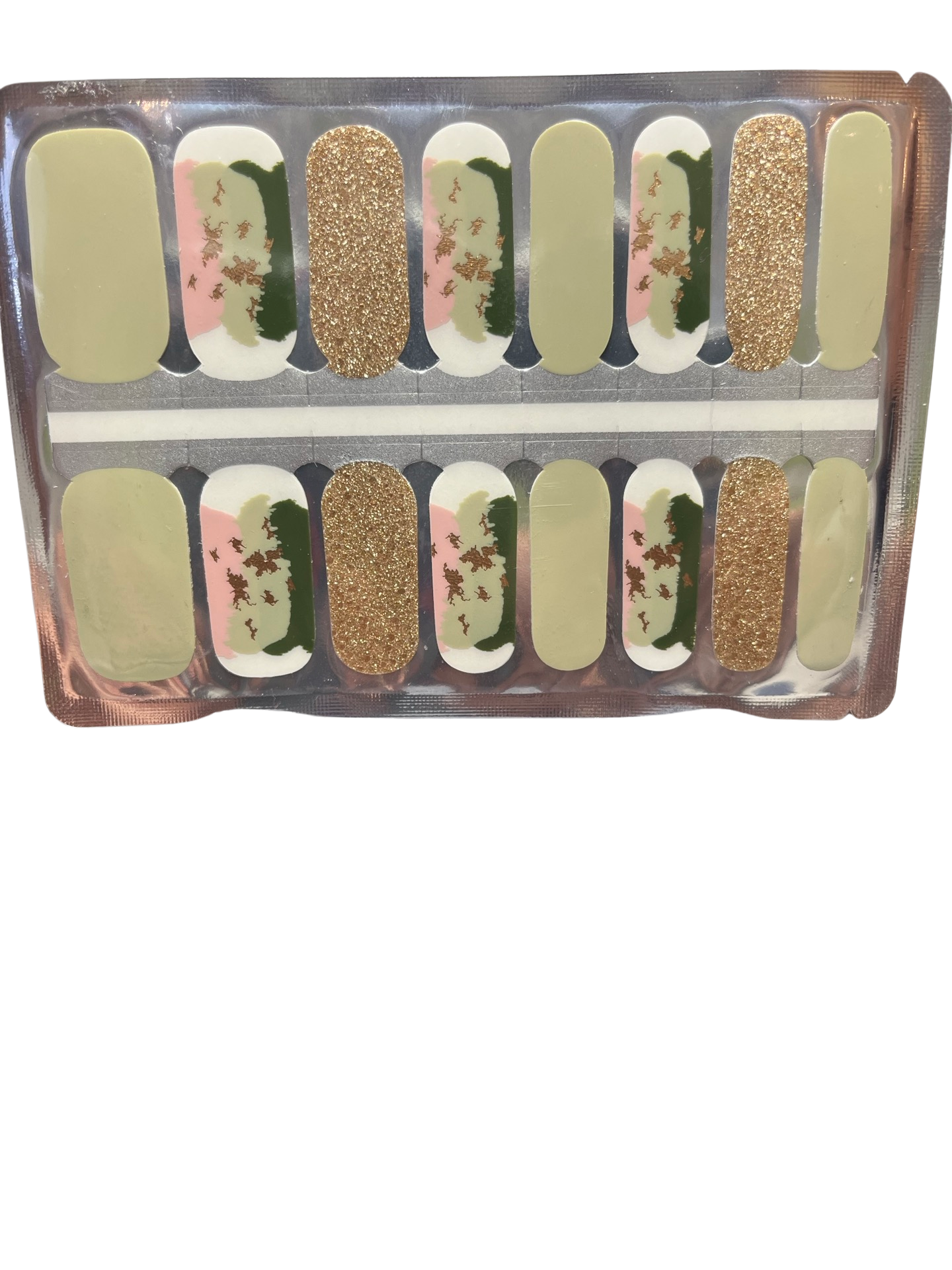 >Pretty mix of mossy green & gold glitter solid wraps + pink, green & gold tip wraps