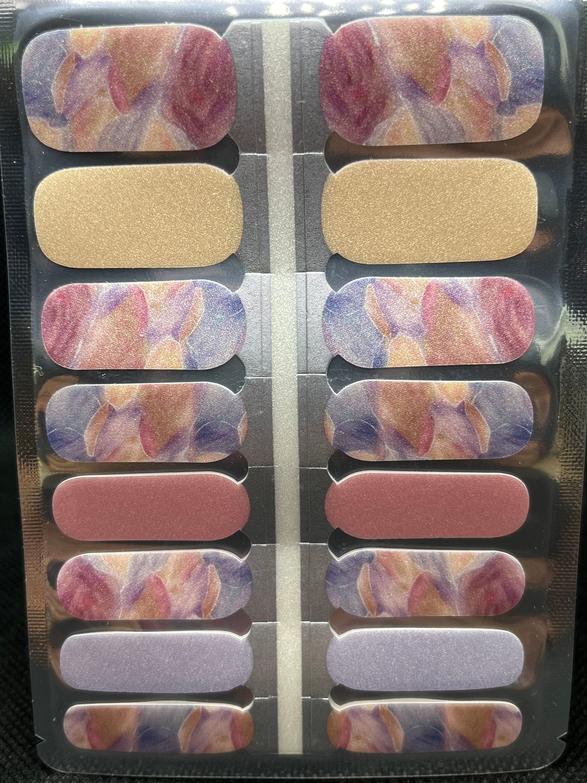 > Shades of pink, gold, and lavender combine to make a collage of colours on ten wraps + one solid wrap each of light pink, lavender and gold.