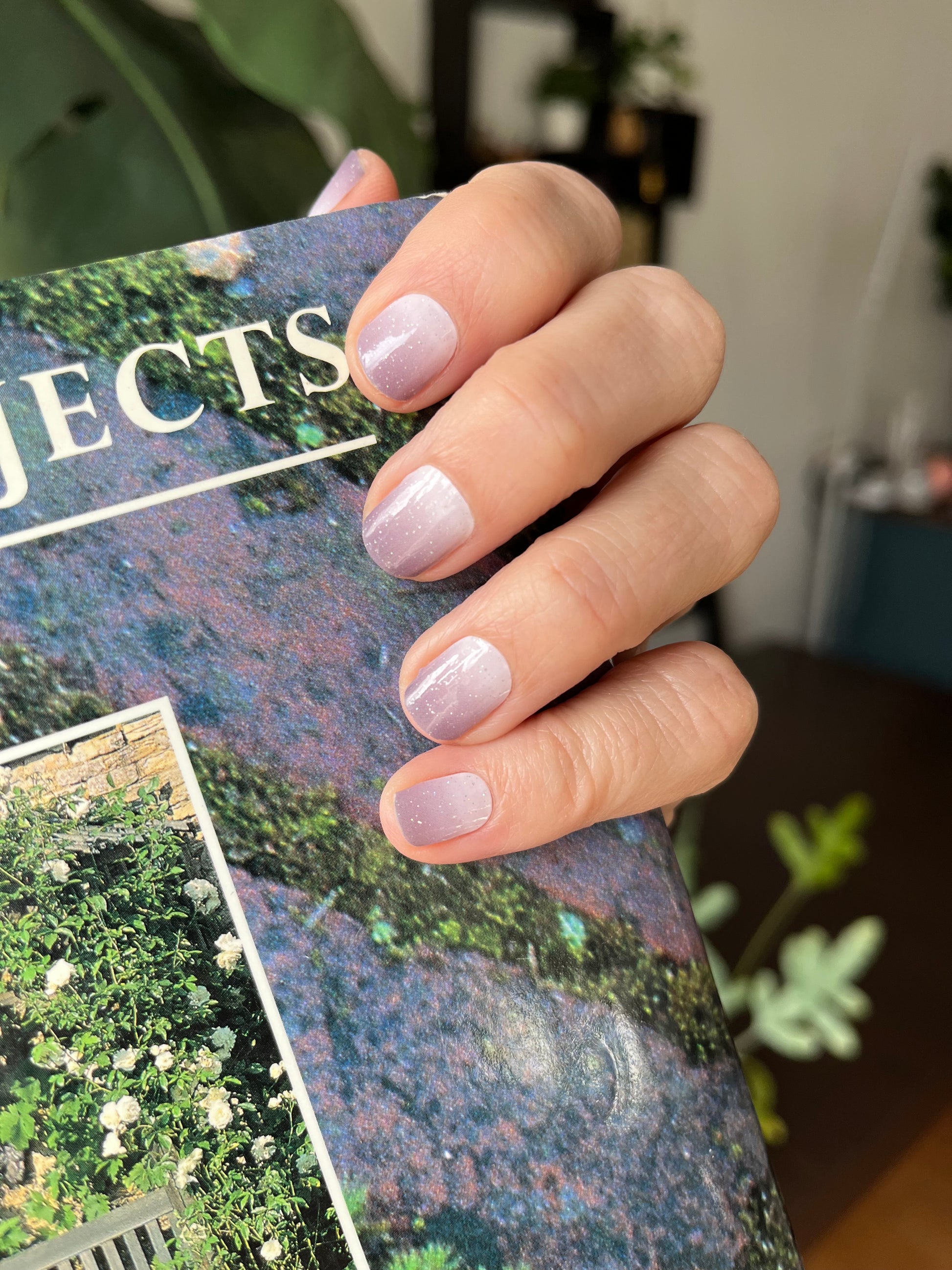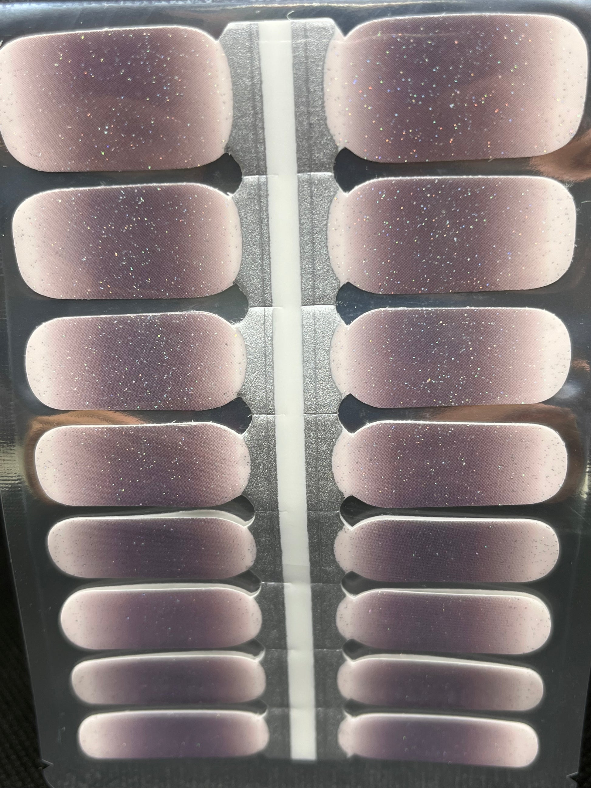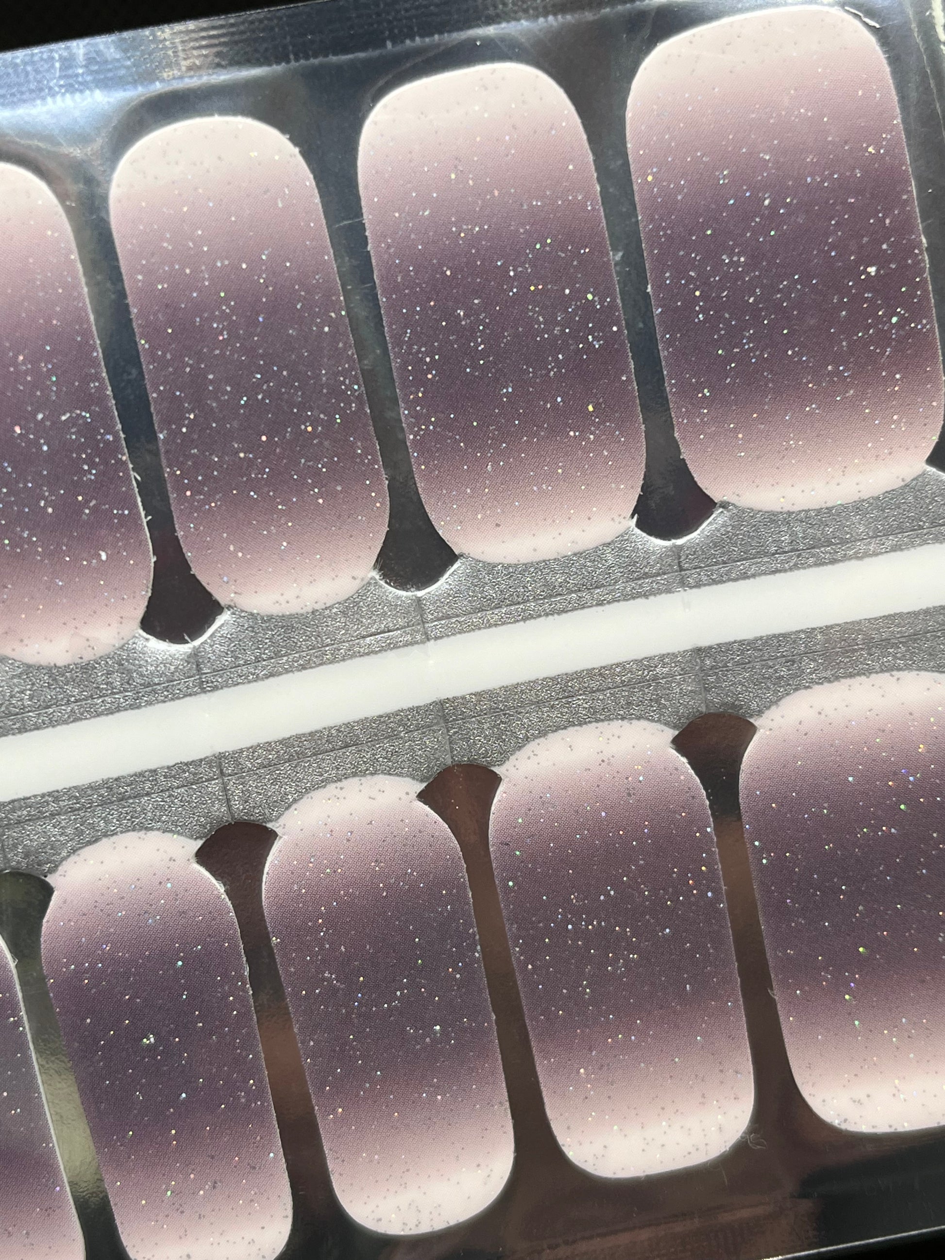 >Super pretty, sophisticated ombre design from light pinky grey at the base of the nail to a darker mauve,grey and topped with a delicate sprinkle of micro glitter.