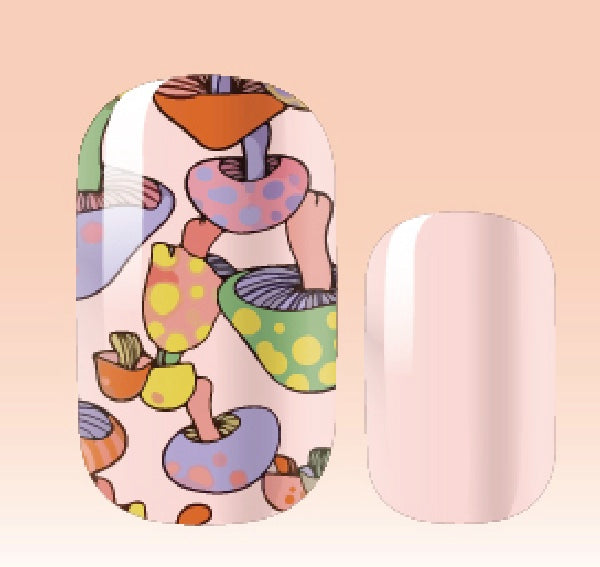 Set of 8 solid pearl-finish pale pink & 8 pale pink background with all-over multi- coloured mushrooms
