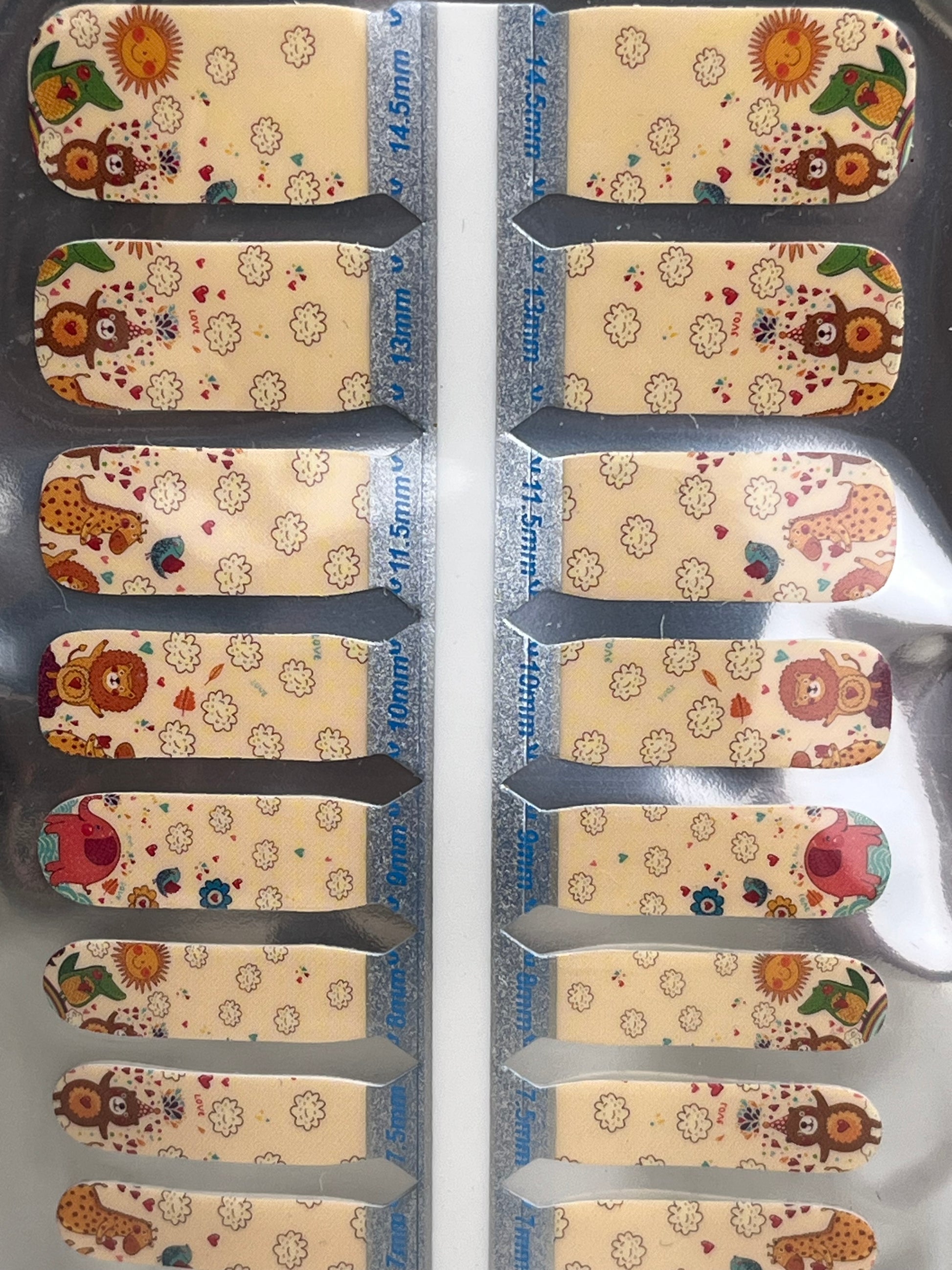 Get ready to celebrate with Wild Party — the kids’ nail wrap set that brings the zoo to you! These bright, cheerful wraps feature adorable cartoon animals decked out for a birthday bash, all set against a soft pale peach background. Lions, elephants, and monkeys in party hats make this design pure fun from fingertip to fingertip.